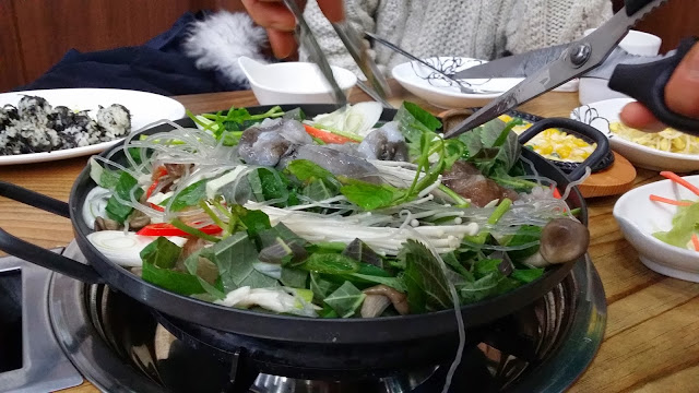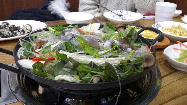 After the movies, we went to dinner. This place was not MY choice. It was an octopus dinner. I took videos on my phone, but I cannot upload them for some reason. It’s a Samsung, and I cannot for the life of me figure it out. In the video, you would see that the octopus goes in the pot alive. Yes, alive. All wiggling about. Slowly it dies as it gets hotter and hotter.